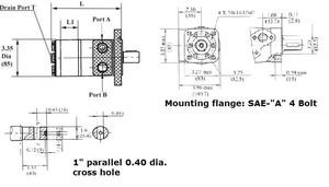 BMPH Series motor, SAE -“A” 4 BOLT mounting flange, 1” parallel 0.40 dia. cross hole drive shaft, 7/8 -14 SAE Port.  Replaces Char-Lynn 101-1855 & 101-1311.